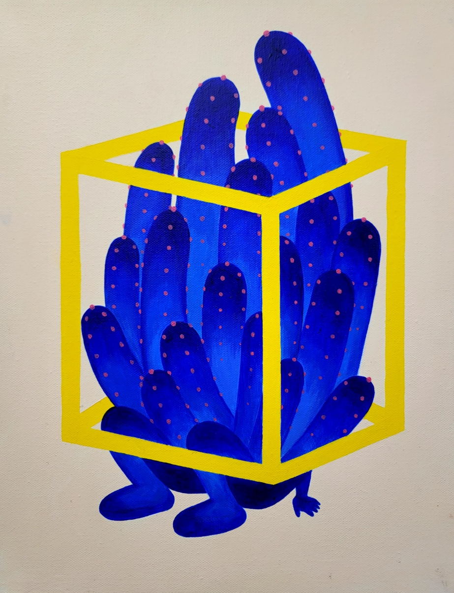 "업 주제는 콤플렉스를 계속 마주하며 스스로를 치유하는 과정이다. 평소 피부 상태를 외면하다가 상태가 악화되면 콤플렉스를 다시 깨닫게 되는 과정에서 더욱 큰 스트레스를 받아왔다. 이 주제가 정해질 때 피부는 외면할 수 없을 정도로 악화된 상태였다. 스트레스에서 벗어나기 위해 그림으로 피부를 표현하며 콤플렉스를 마주하기로 결심했다. 피부에 가시가 박힌 것 같은 따가움이 느껴졌고 움직일 때마다 갈라지는 것이 보였다. 따가움은 선인장과 가시로, 갈라지는 피부는 사막으로 표현했다."