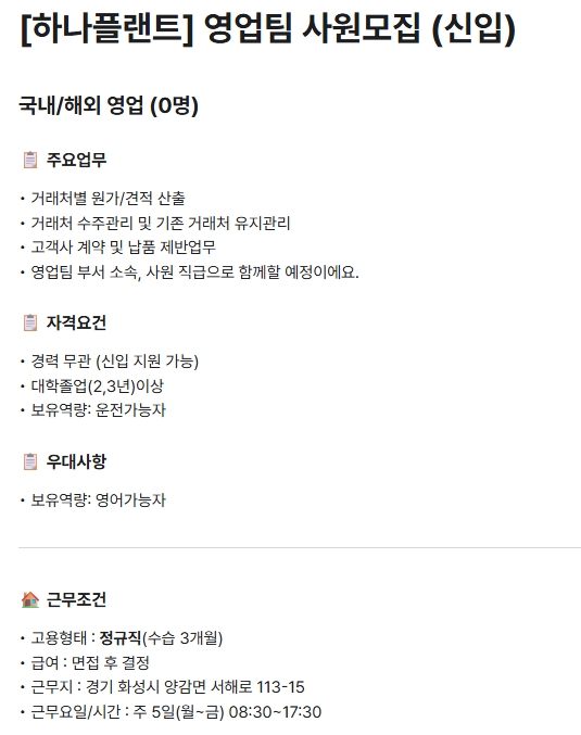 [하나플랜트] 영업팀 사원 모집(신입)